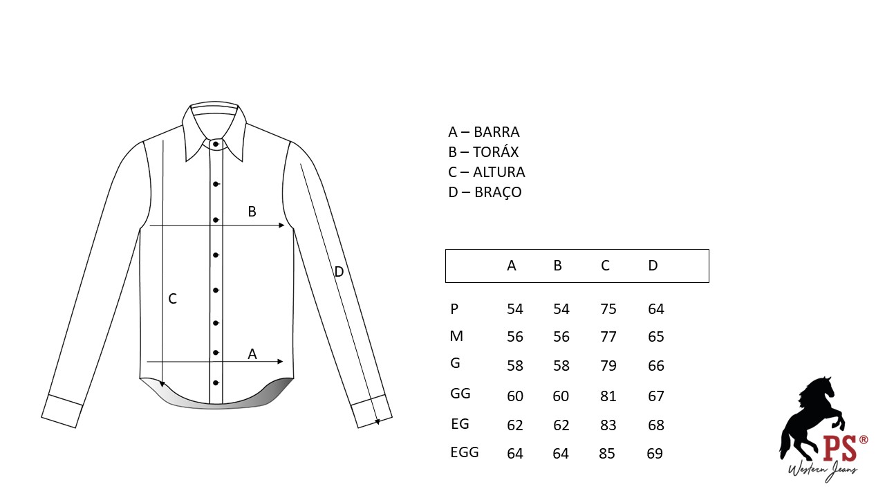O modelo conta com bordado exclusivo Puro Sangue no peito, reforçando a identidade western e a autenticidade do universo country. Os botões personalizados complementam o acabamento premium da peça.